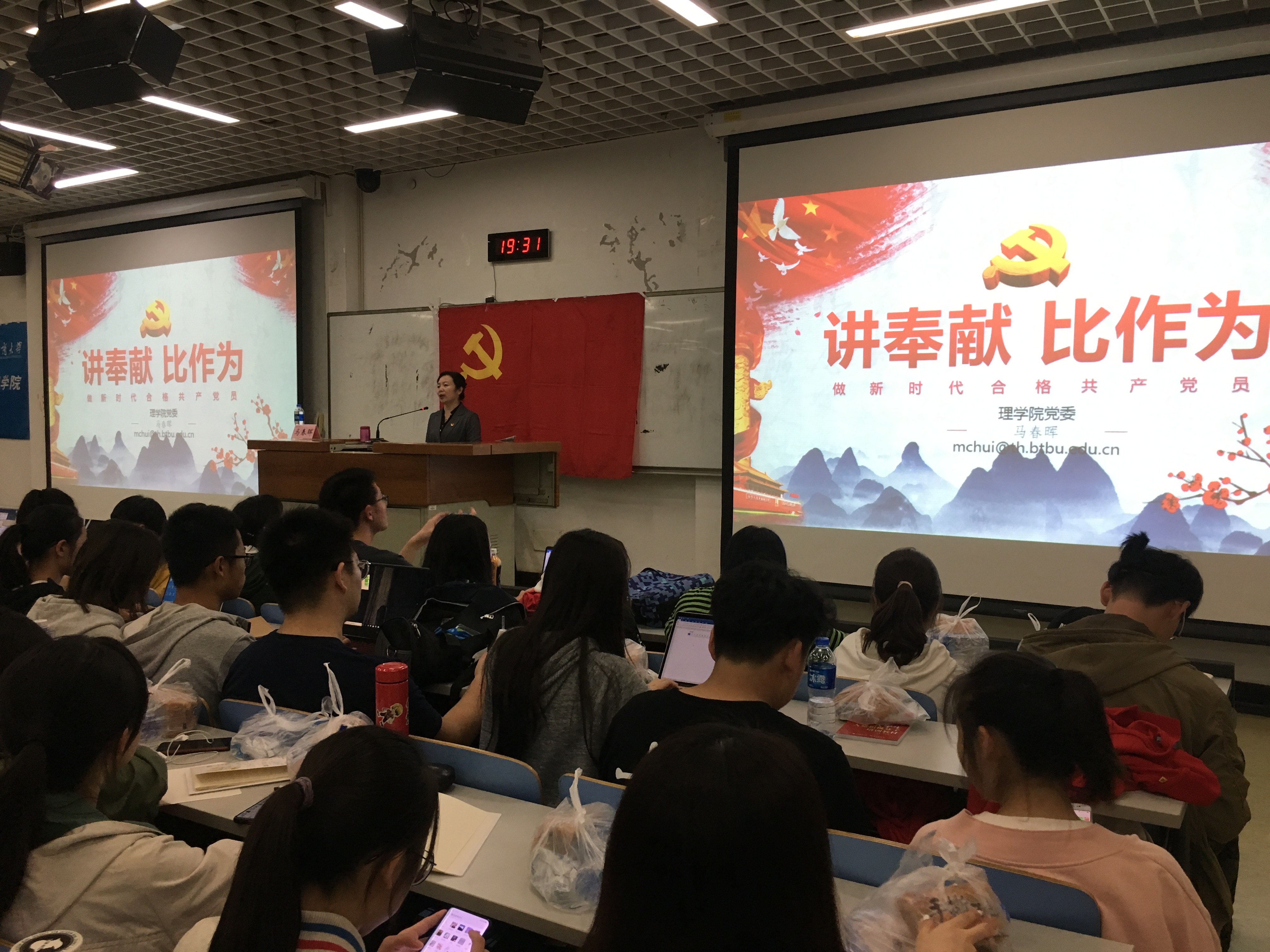 10月11日晚,理學(xué)院、數(shù)學(xué)與統(tǒng)計(jì)學(xué)院、經(jīng)濟(jì)學(xué)院聯(lián)合分黨校入黨積極分子培訓(xùn)班第二場(chǎng)講座在良鄉(xiāng)校區(qū)正式開(kāi)課,理學(xué)院黨委書(shū)記馬春暉講授了題為“講奉獻(xiàn),比作為,做新時(shí)代合格共產(chǎn)黨員”的生動(dòng)一課。
