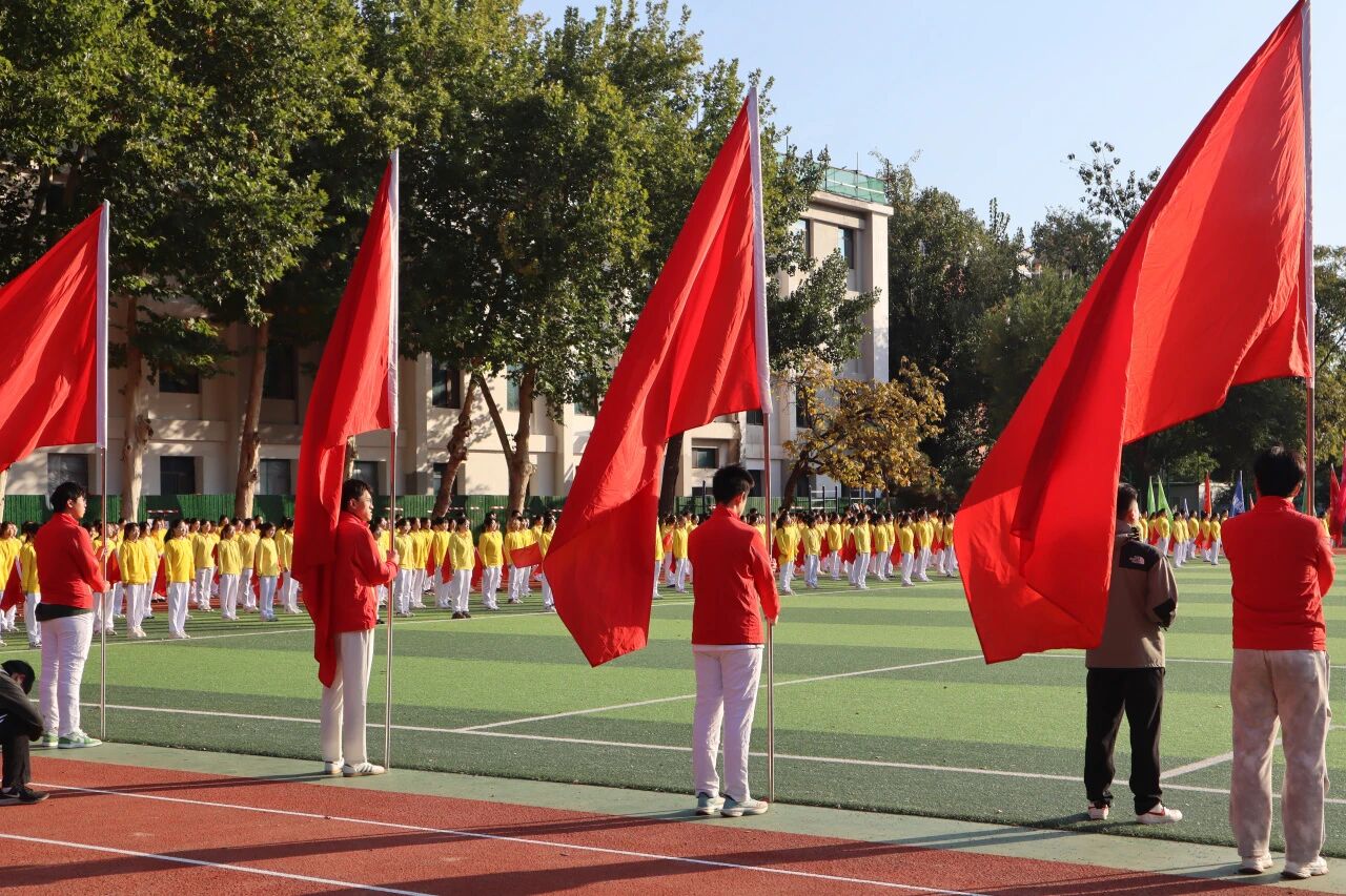 五星紅旗冉冉升起,全場(chǎng)師生共同唱響國(guó)歌。